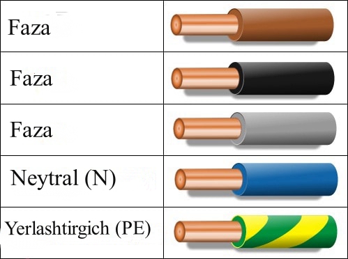 Tolalar rangi bo’yicha jadval bor buni hamma tajribalik elektriklar biladi. U yerda asosiy faza tolalari, nol, yerlashtirgich, qaysi tusda belgilanishi yozilgan. Bu montaj vaqtida qaysi o’tkazgich qayerga ulanishini ko’rish, qulay bo’lishi uchun amalga oshirilgan. Faza o’tkazgichlari tuslari bo’yicha farq qilishi mumkin, «yerlashtirgich» har doim yashil+sariq rangga bo’yaladi.