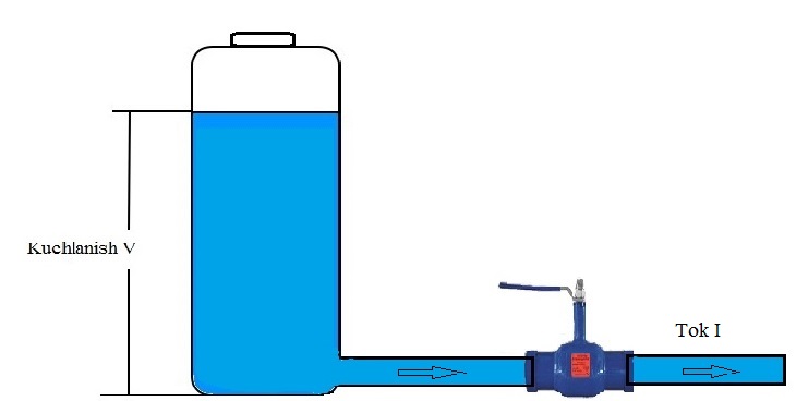 Batareya kuchlanishi 1.5 volt, Avtomobil akkumulyatori kuchlanishi 12 volt, rozetkadagi kuchlanish 220 voltga teng. Elektronikadagi kuchlanish va oʻtkazgichdagi barcha jarayonlarni koʻzimiz bilan koʻrmaganligimiz sababli, elektr kattaliklarni tushunish, tasavvur qilish oson boʻlishi uchun, suvga nisbatan qiyoslab, gidravlik sxemasi bilan oʻrganib chiqamiz. Biz hammamiz suv toʻldirilgan bochka yoki sigʻimlarni koʻrganmiz.